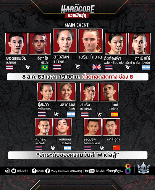 ช่อง 8 จัดหนักจัดเต็มกับที่สุดของกีฬาการต่อสู้ ที่พร้อมให้แฟนมวยได้สัมผัสความมันส์ช่วงสุดสัปดาห์นี้ "มวยฮาร์ดคอร์มวยพันธุ์ดุ" วันเสาร์ที่ 8 สิงหาคม เตรียมพบกับสุดยอดมวยหญิงเบอร์ 1 แห่งยุค "สาวสิงห์ ส.โสพิศ" ขึ้นวัดศักดิ์ศรี กับ แชมป์หลายเวที จากสหราชอาณาจักร "เอริน โควาล ส่วน"มวยไทยซุปเปอร์แชมป์" อาทิตย์ที่ 9 สิงหาคม ชมการวัดฝีมือกันของสองนักมวยอาวุธอันตราย "เบ็คแฮม สิงห์ป่าตอง" มวยแข้งหนักหมัดคมลูกครึ่งไทย-ญี่ปุ่น ปะทะ จอมอัจฉริยะจากอิหร่าน "ซาจาด ซัตตารี่"คุณนงลักษณ์ งามโรจน์ กรรมการผู้จัดการ สถานีโทรทัศน์ช่อง 8 เผยว่า สำหรับรายการมวยทั้ง 2 รายการ ถือว่าเป็นไฮไลท์ของทางช่อง 8 ที่มีแฟนมวยติดตามอยู่ทั่วประเทศ หลังที่ประสบความสำเร็จได้รับความสนใจจากแฟนมวยอย่างมากในการกลับมาจัดอีกครั้งในยุคโควิด-19 เราก็ต้องเน้นคุณภาพของรายการอย่างต่อเนื่อง สำหรับในวันเสาร์ รายการ มวยฮาร์ดคอร์มวยพันธุ์ดุ แฟนมวยจะได้ดูมวยหญิงระดับคุณภาพที่ถือเป็นสุดยอดของนักมวยหญิงยุคนี้ ขณะที่ในวันอาทิตย์ มวยไทยซุปเปอร์แชมป์ กับการต่อสู้ของนักมวยระดับแชมป์เปี้ยน ถือว่าประกบคู่ได้น่าสนใจอย่างมาก และมั่นใจว่า รายการมวยทั้ง 2 รายการจะมอบความสุขให้กับแฟนมวยทั่วประเทศตลอดสุดสัปดาห์นี้