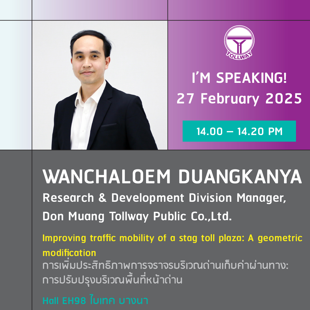 27 กุมภาพันธ์ 2568 เวลา 13.40 - 14.00 น. ดร.ศักดิ์ดา พรรณไวย กรรมการผู้จัดการใหญ่ DMT บรรยายหัวข้อพิเศษ "Toll Road Management: Bangkok Practices and Experience"